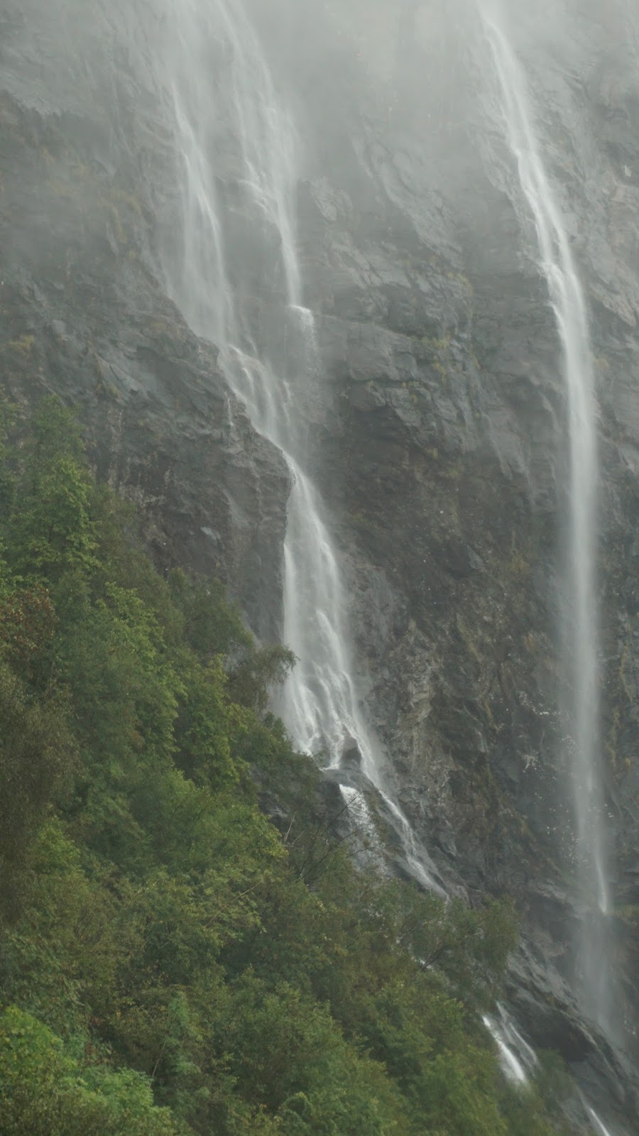Our beautiful view has gone. We can see an eider duck wandering around in the fjord by Hamish but nothing else. It's raining heavily and we are in a cloud. It's just Hamish, the motor homes next to us and the four that have crammed in by the pier as the spaces had gone. So we head back up to the Sandfossen falls for breakfast where H can be on his own with the rain and the river. When it rains here it is extremely wet and you can see just about 20 metres. l suppose it is where all these lochs and fjords come from.